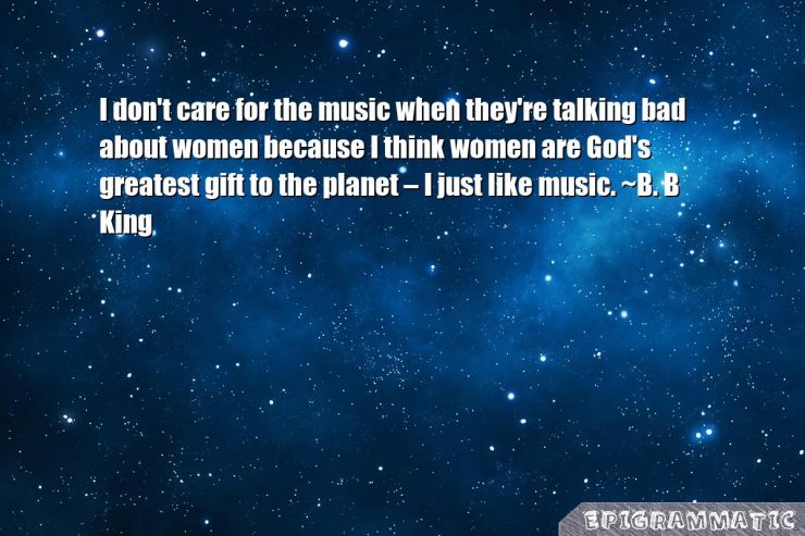 B. B King Quotes B. B King I don't care for the music when they're talking bad about women because I think women are God's greatest gift to the planet – I just like music. Bad Care Gift God Music Think Women