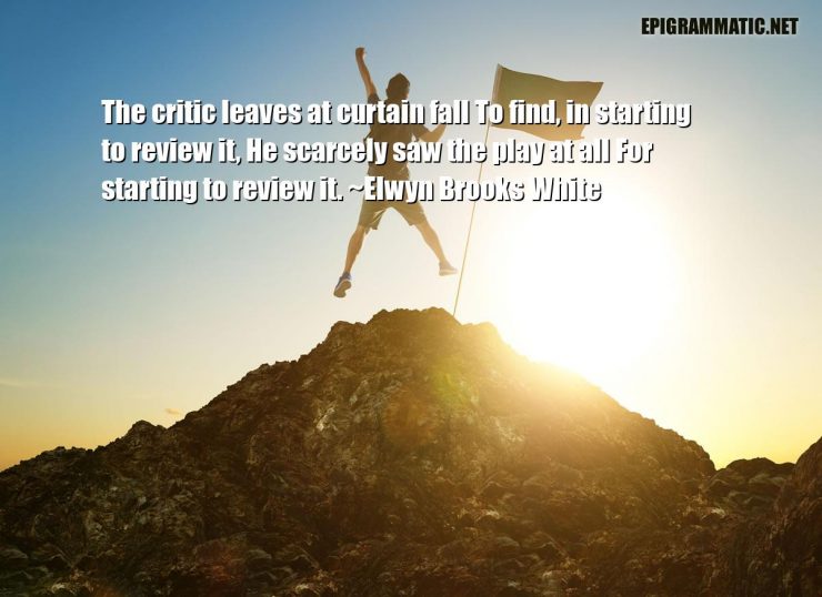 Elwyn Brooks White Quotes Elwyn Brooks White The critic leaves at curtain fall To find, in starting to review it, He scarcely saw the play at all For starting to review it. Critic Curtain Fall Find He Leaves Play Review Starting