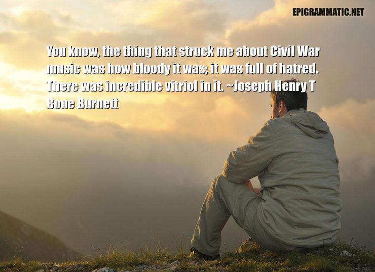 Joseph Henry T Bone Burnett Quotes Joseph Henry T Bone Burnett You know, the thing that struck me about Civil War music was how bloody it was; it was full of hatred. There was incredible vitriol in it. Bloody Civil War Civil War Music Full Hatred Me Music Thing Vitriol War You