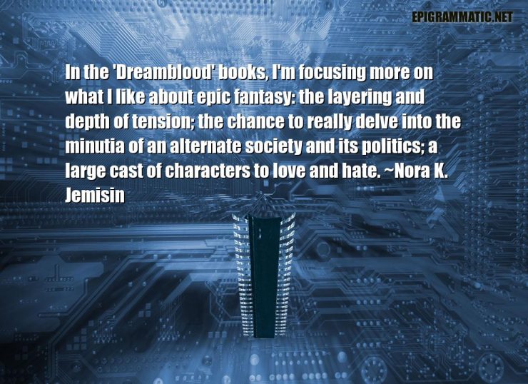 In the 'Dreamblood' books, I'm focusing more on what I like about epic fantasy: the layering and depth of tension; the chance to really delve into the minutia of an alternate society and its politics; a large cast of characters to love and hate.