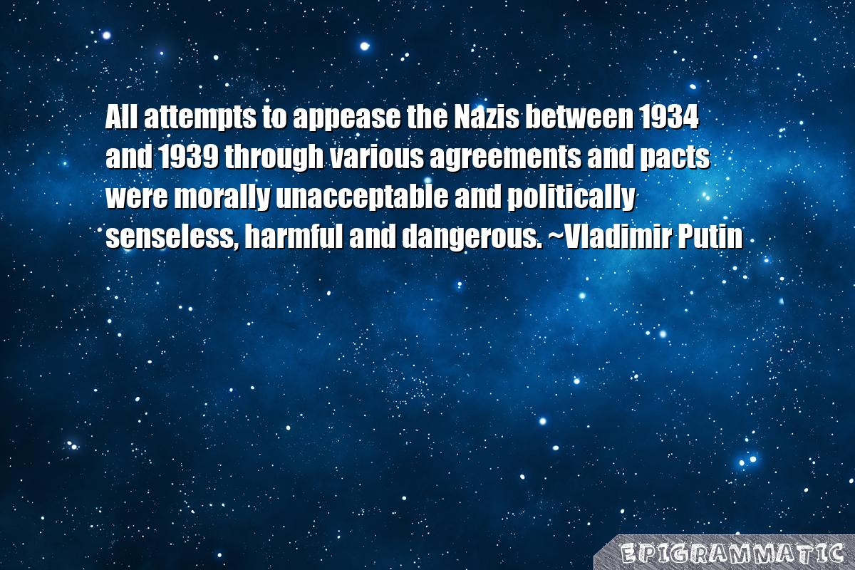 All attempts to appease the Nazis between 1934 and 1939 through various agreements and pacts were morally unacceptable and politically senseless, harmful and dangerous. Vladimir Putin Agreements • Attempts • Between • Dangerous • Harmful • Nazis • Politically • Through • Various