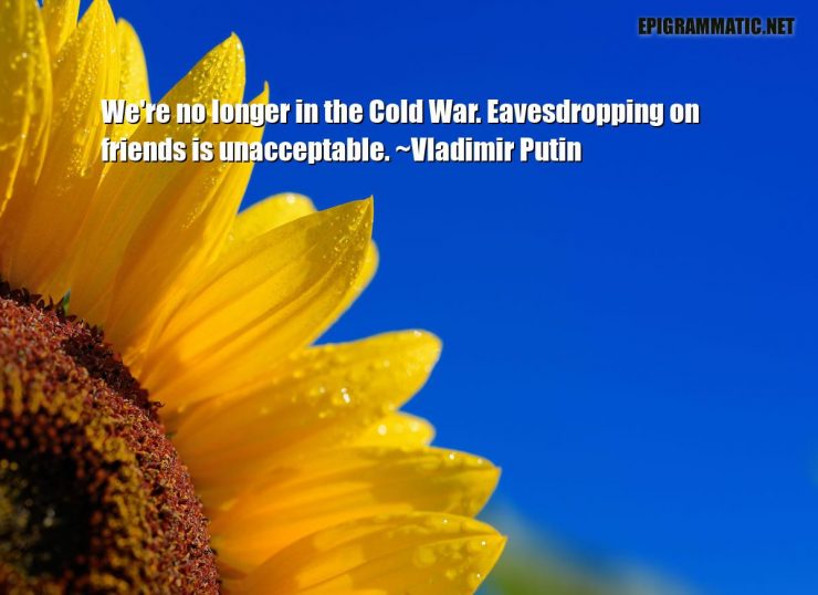 Vladimir Putin Quotes Vladimir Putin We're no longer in the Cold War. Eavesdropping on friends is unacceptable. Cold Cold War Eavesdropping Friends Longer Unacceptable War