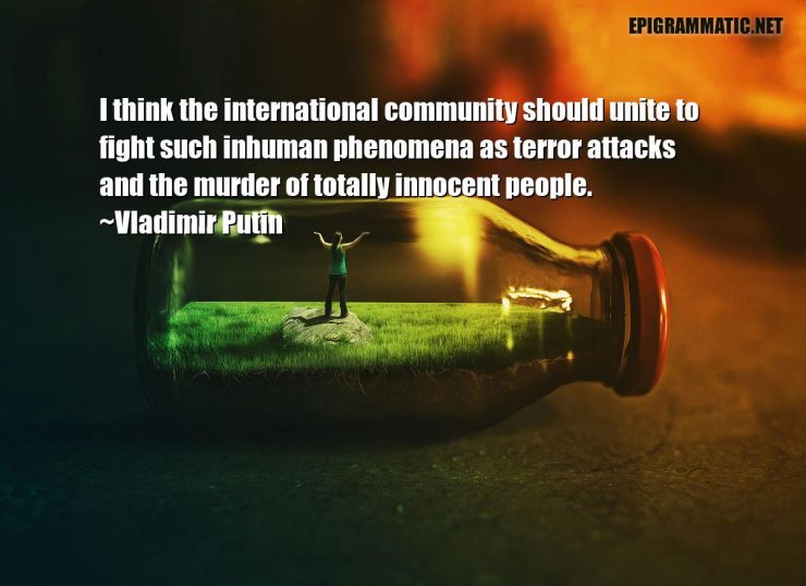 Vladimir Putin Quotes Vladimir Putin I think the international community should unite to fight such inhuman phenomena as terror attacks and the murder of totally innocent people. Attacks Community Fight Inhuman International Murder People Phenomena Terror Think Unite